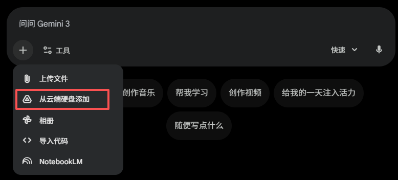将特定场景的对话指令都放到 Google 文档中,需要引入的时候从云端硬盘添加即可,这时候就将额外指令引用到对话中了。