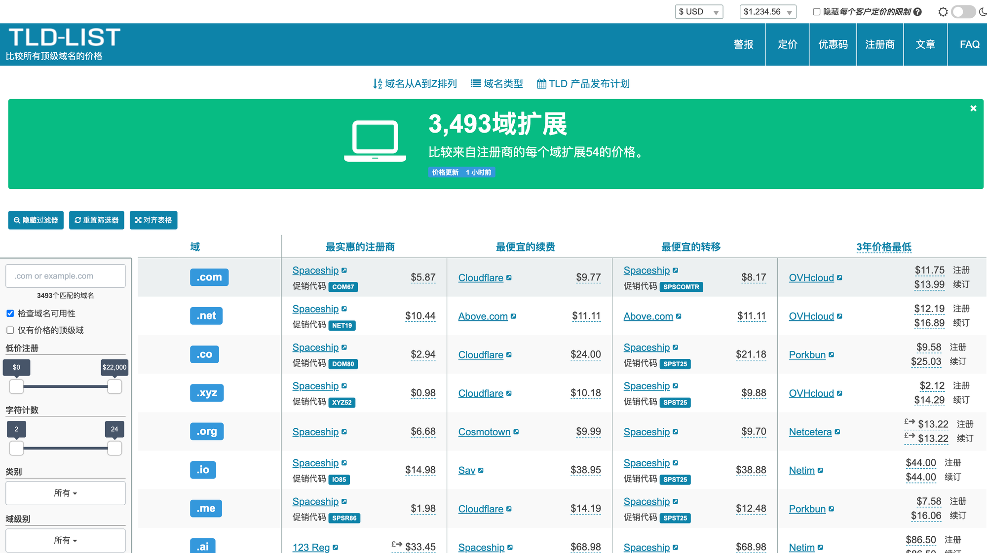 - 支持超过 3400 个域名后缀,支持全球数十家主流注册商的价格对比;